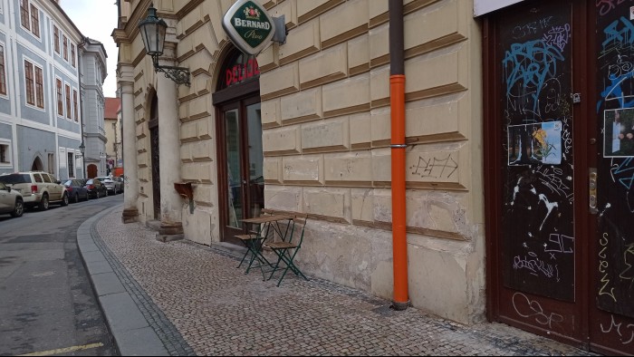 Štupartská ulice, Praha 1. Rozbitý chodník se nachází v těsné blízkosti obchodu se suvenýry a sklem a kavárnou - Cafe Galerie Ungelt.
