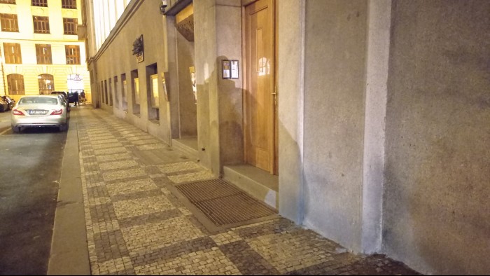 Rozbitý chodník v centru města. Budova Ústřední knihovny zasahuje na Mariánské náměstí, dále do ulice Valentinské a také do Žatecké ulice. A právě v Žatecké ulici je rozbitý chodník.
