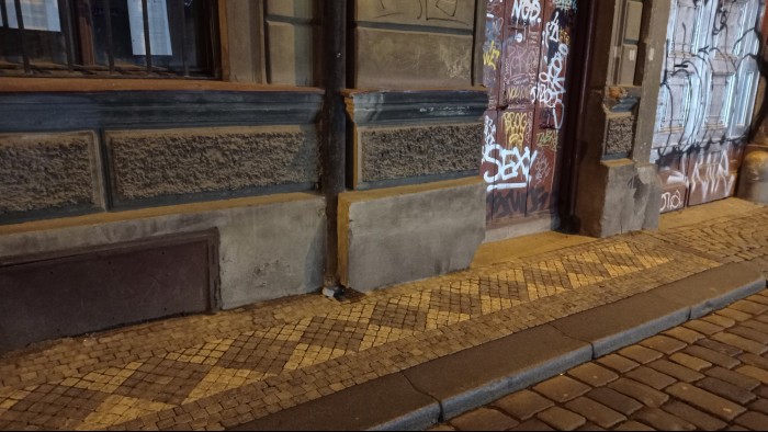 Rozbitý chodník na úzkém chodníku v centru Prahy