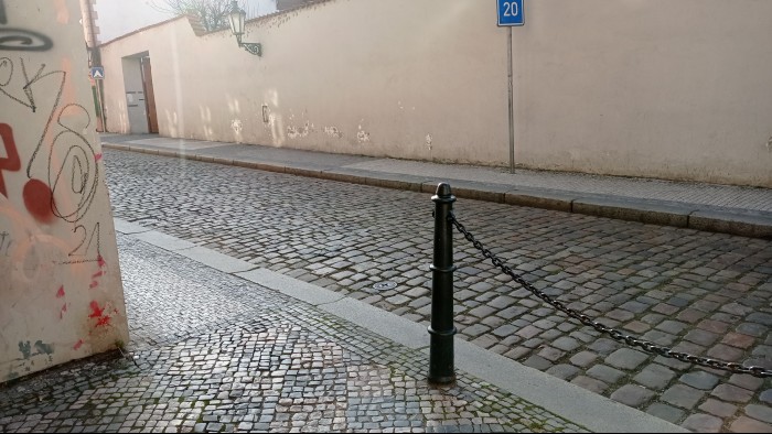 U Lužického semináře č. 48 je rozbitý chodník a uvolněný sloupek
