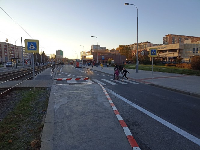 Policie i statistiky dopravní nehodovosti potvrzují, že místo patří mezi nejrizikovější v Praze. S tím je konec. Frekventovaným přechodem spojujícím část sídliště s obchodním centrem ve špičkách přejde 120 až 150 chodců za hodinu. Pro jejich bezpečnost svedeme před ním dopravu do jednoho jízdního pruhu v obou směrech, aby přechod konečně splňoval normu.
