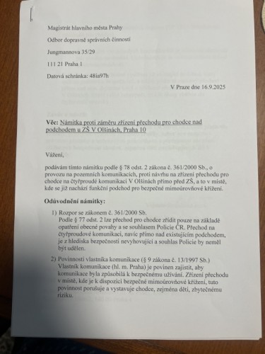 Zadavatel podnětu podal dne 16.9.2025 námitku proti záměru zřízení přechodu pro chodce nad podchodem u ZŠ v Olšinách Magistrátu hl. města Prahy.