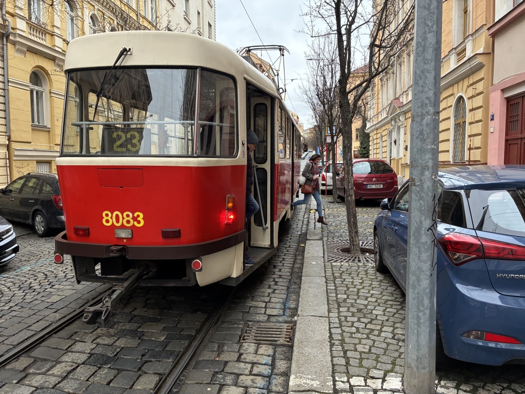 Po vystoupení z tramvaje si musí cestující MHD najít cestu mezi tramvají a vozidly zaparkovanými (legálně) na chodníku.