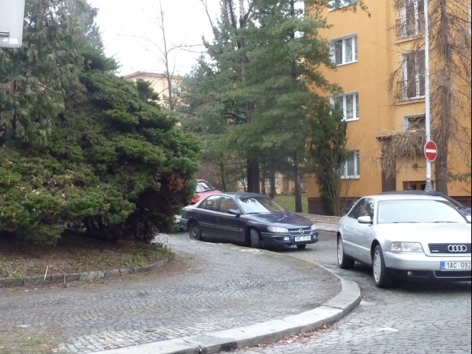 Zarostlý chodník na rohu Krupské a Nučické