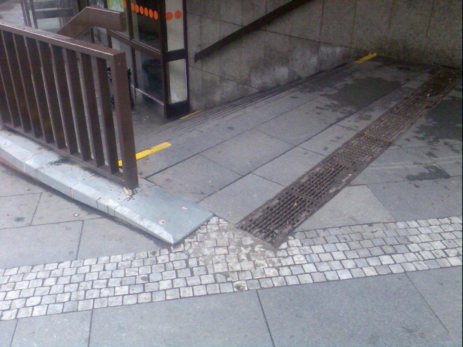 Nad schody u metra Strašnická (na konci odtokového kanálku) chybí kus dlažby.