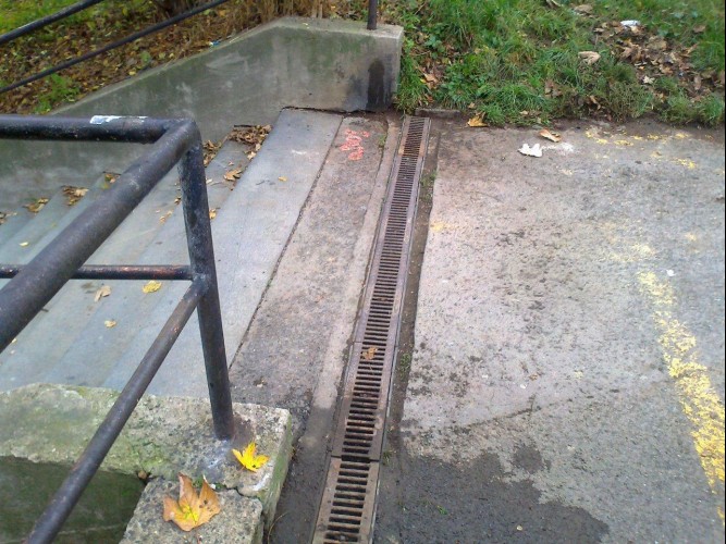 Ucpaný kanálek u vrchní hrany schodiště na rohu ulice Borodinská a Smolenská.