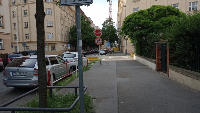 Zarostlý chodník na rohu Slezské a Libické