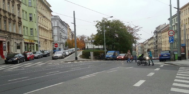 Chybějící přechod na křižovatce Kateřinská – Ke Karlovu